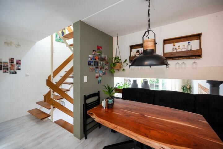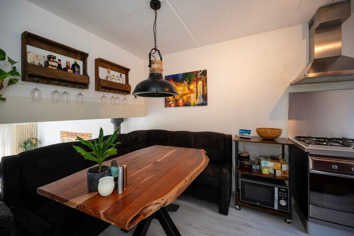 Je komt binnen via de verhoogde entreehal met garderobe en een modern, betegeld toilet met fonteintje. De halfopen keuken is strak afgewerkt en voorzien van voldoende kastruimte en sfeervolle verlichting. Vanuit de hal zijn zowel het souterrain als de bovenverdiepingen bereikbaar, wat de splitlevelstructuur tot leven brengt.